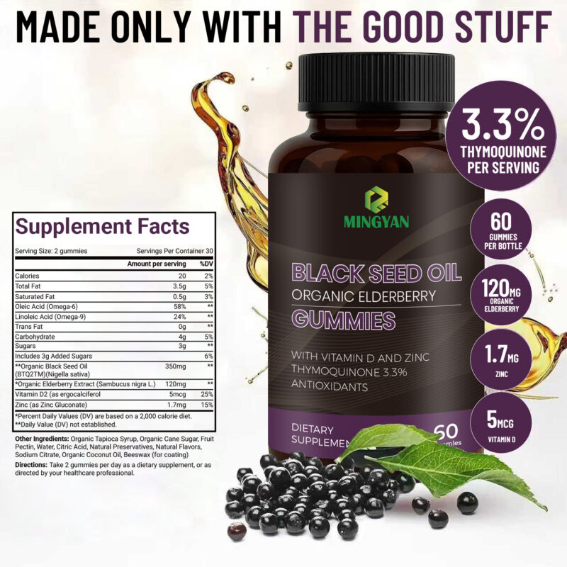 Main Ingredient Organic Black Seed Oil, Organic Elderberry Extract, Vitamin D2, Zinc