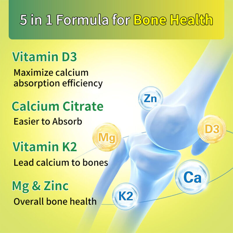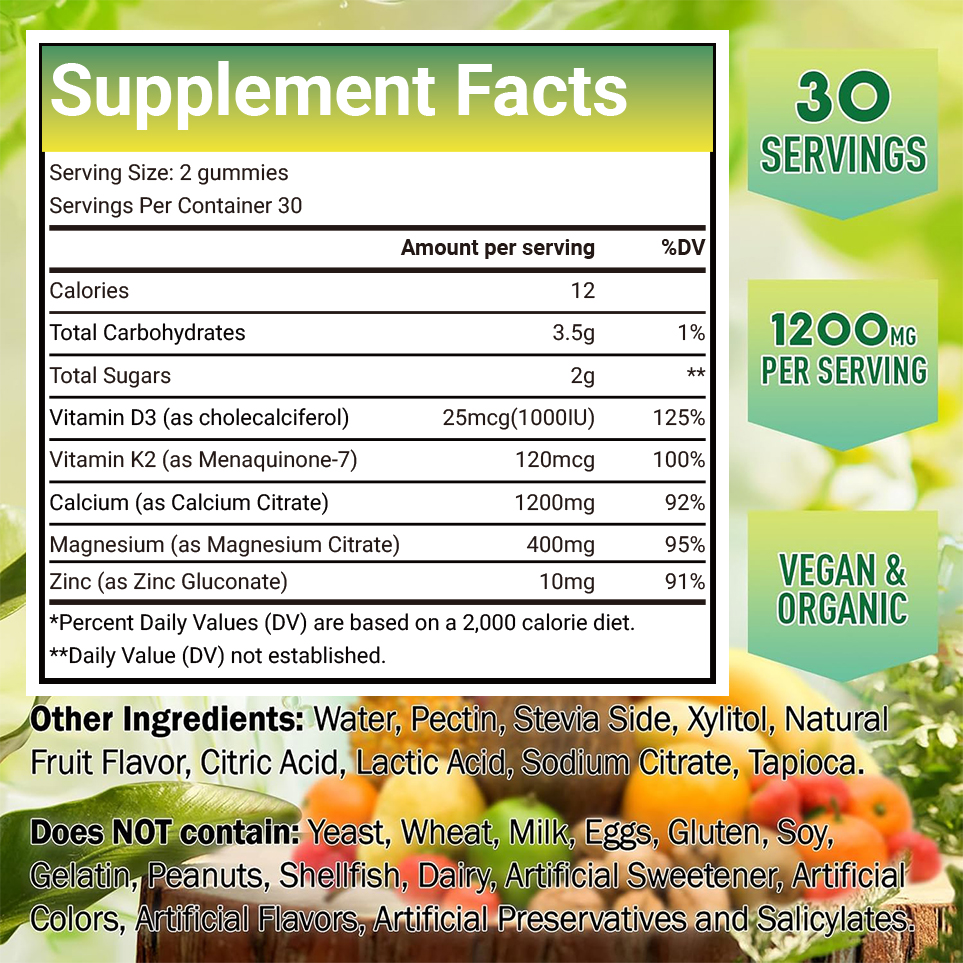 Main Ingredient Vitamin D3 (as cholecalciferol), Vitamin K2 (as Menaquinone-7), Calcium (as Calcium Citrate), Magnesium (as Magnesium Citrate), Zinc (as Zinc Gluconate)