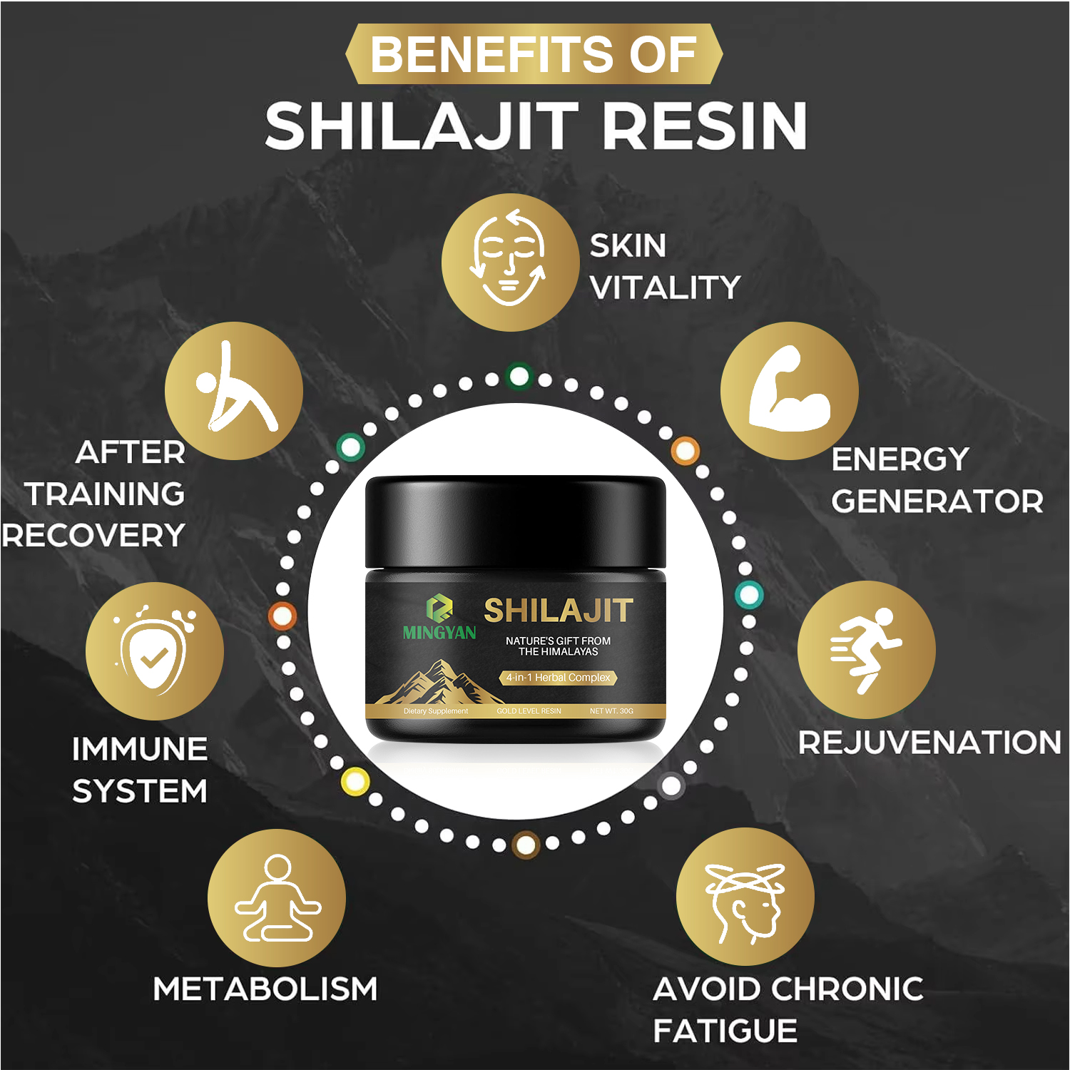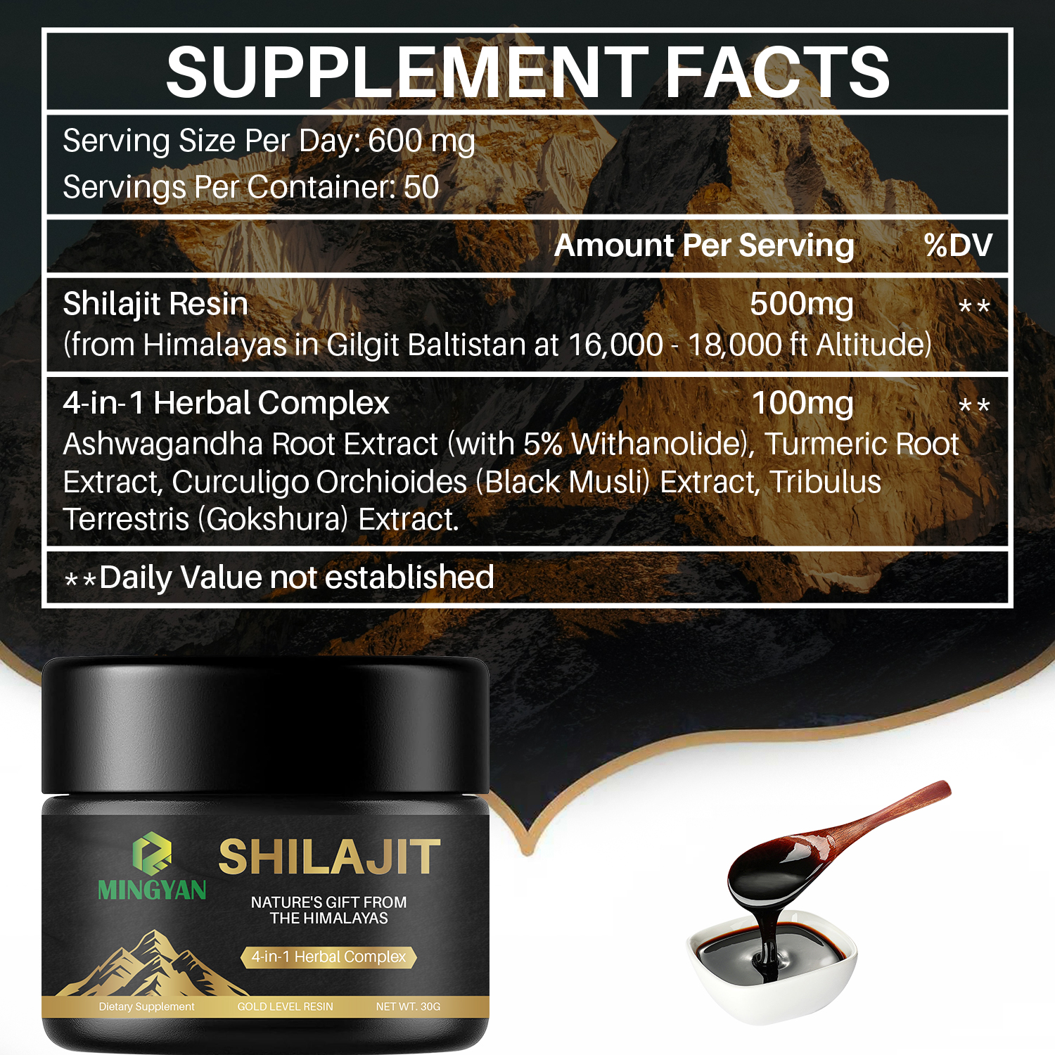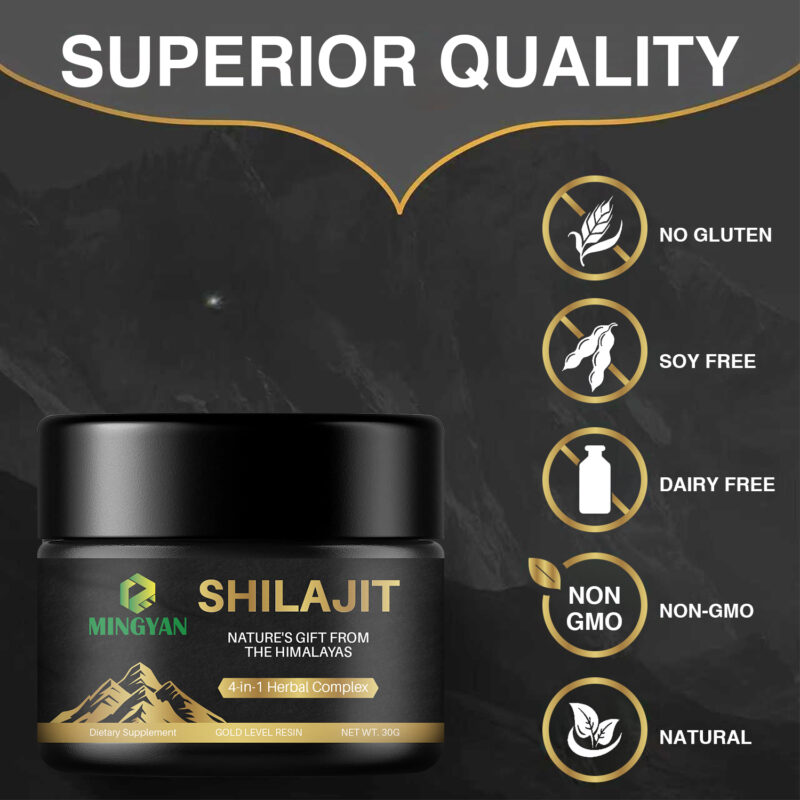 Shilajit Resin, 4-in-1 Herbal Complex: Ashwagandha Root Extract, Turmeric Root Extract, Curculigo Orchioides (Black Musli) Extract, Tribulus Terrestris (Gokshura) Extract |