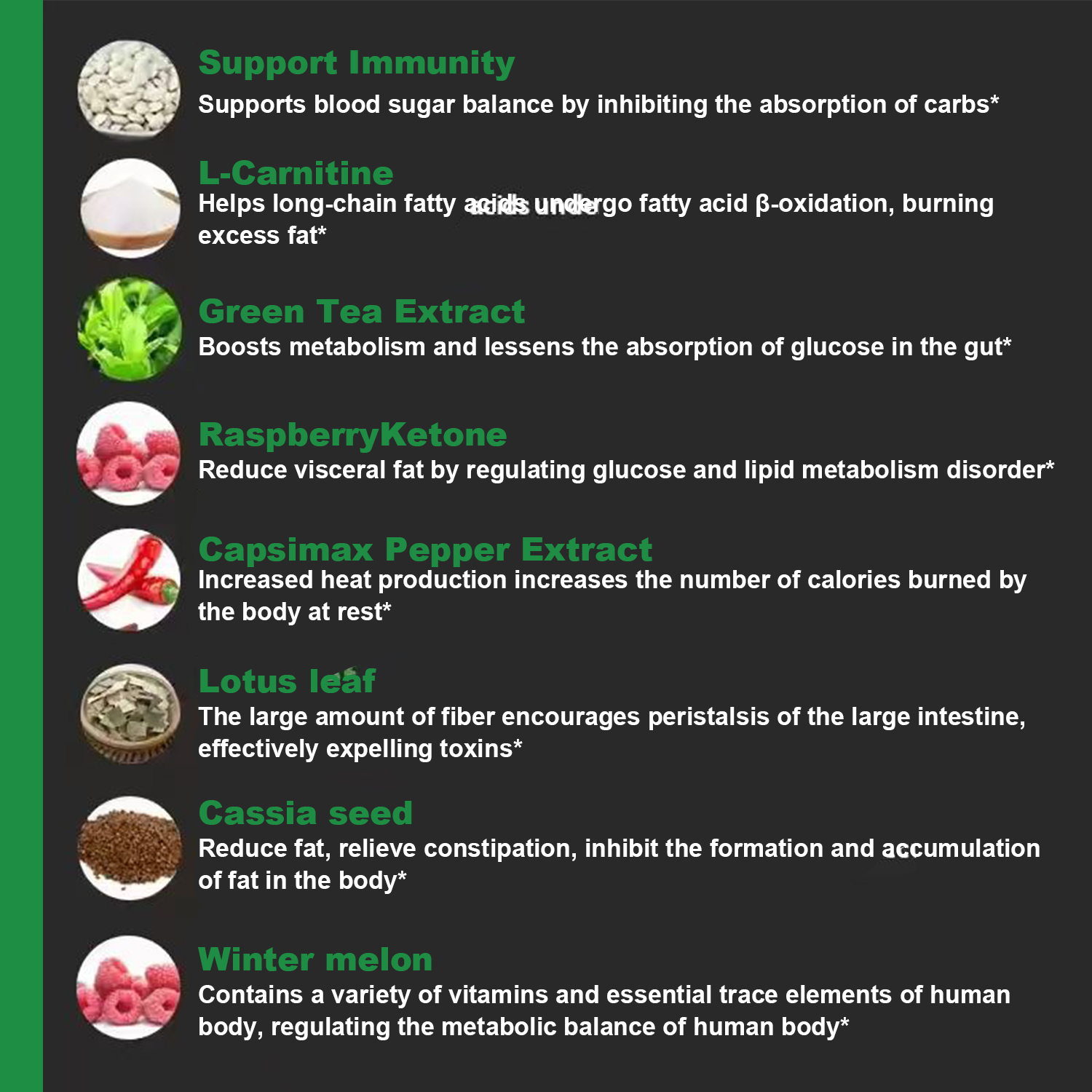 Main Ingredient L-Carnitine, Green Tea Extract, RaspberryKetone, Capsimax Pepper, Lotus Leaf, Cassia Seed, Winter Melon